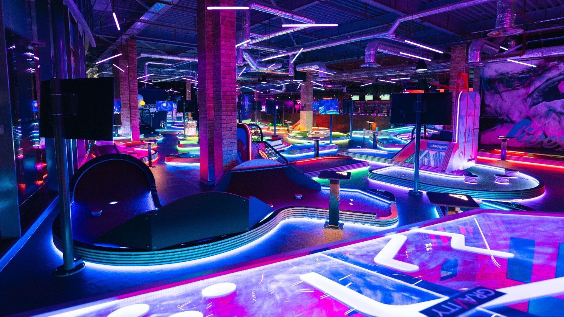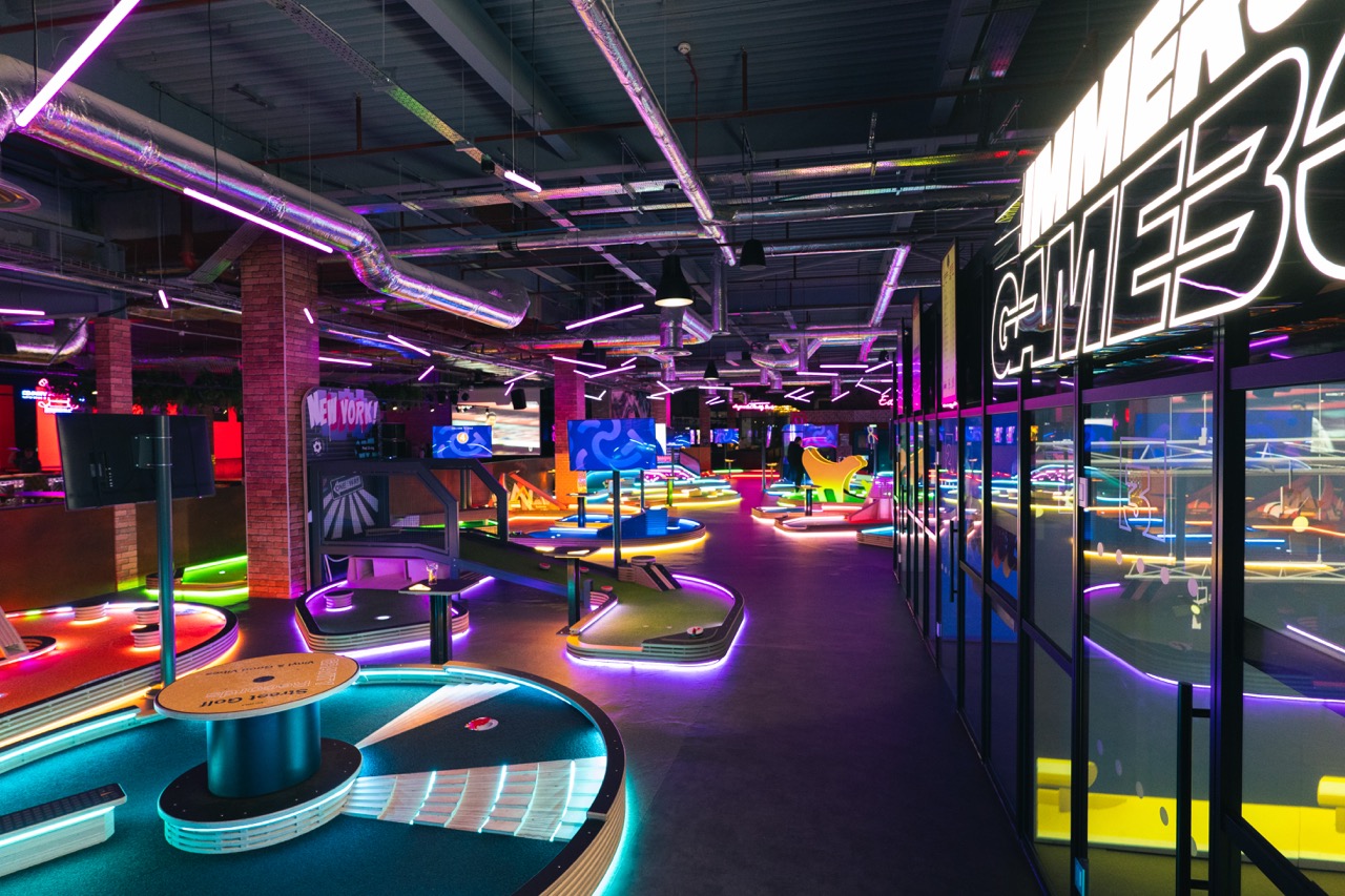 • An 18-hole mini golf course (with dynamic ceiling-mounted moving batons)