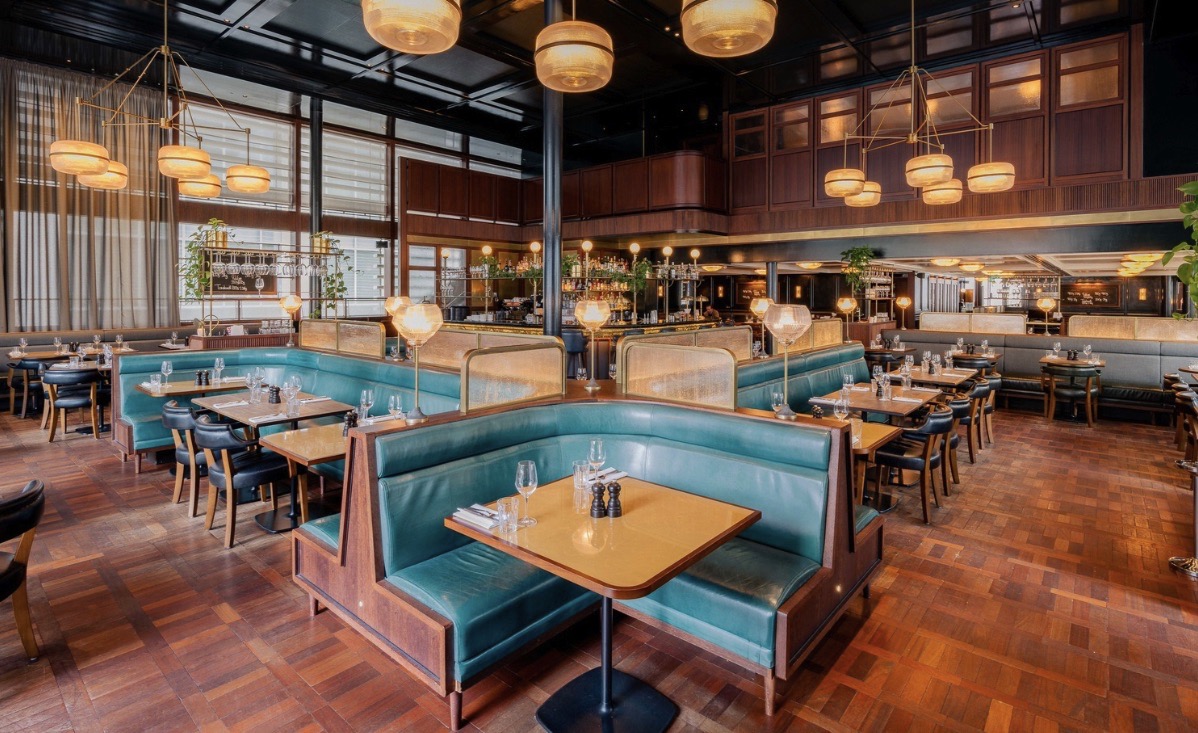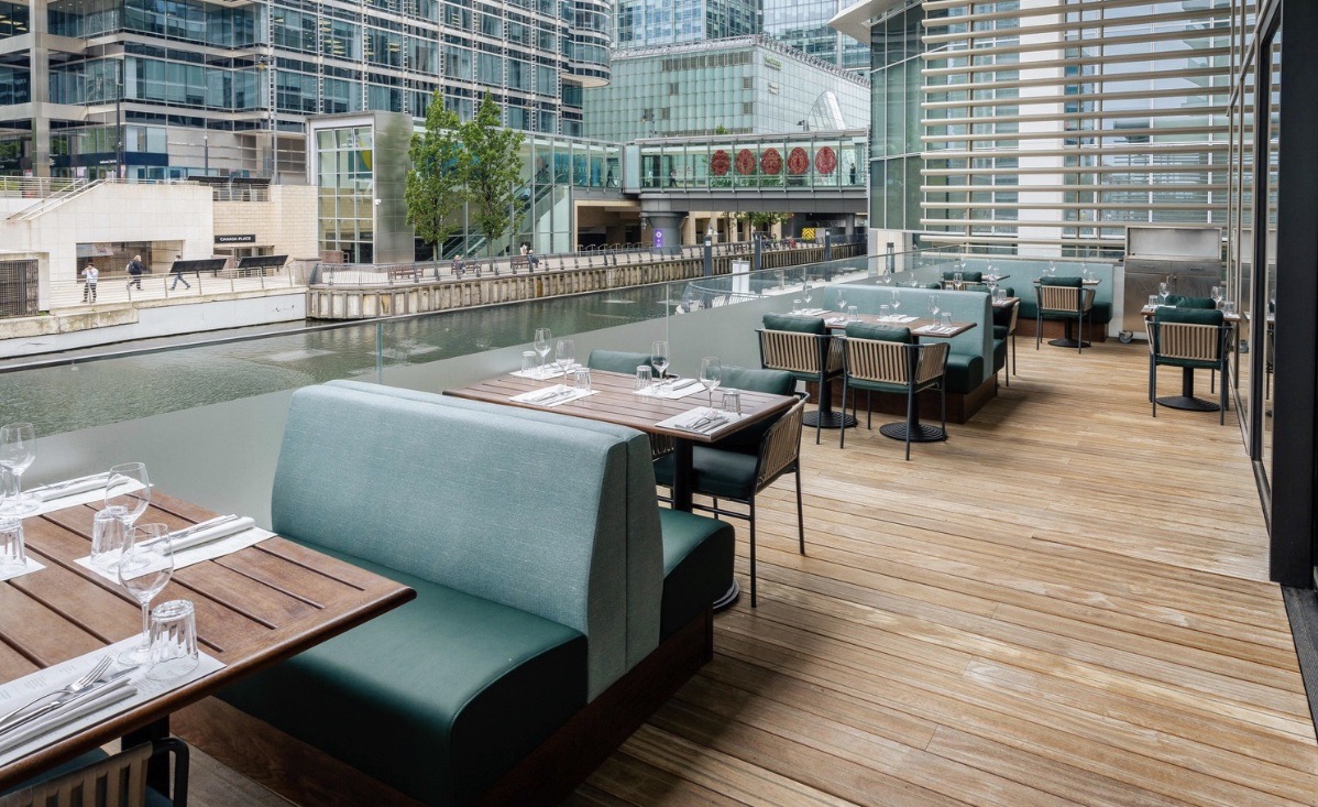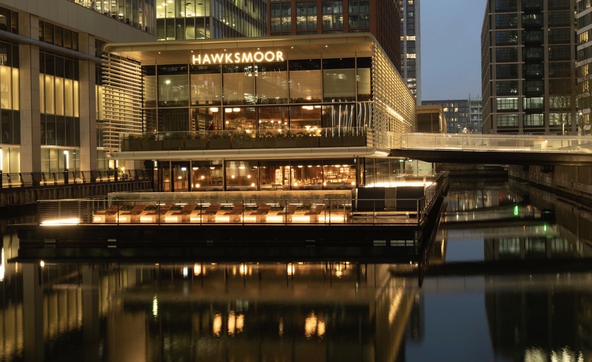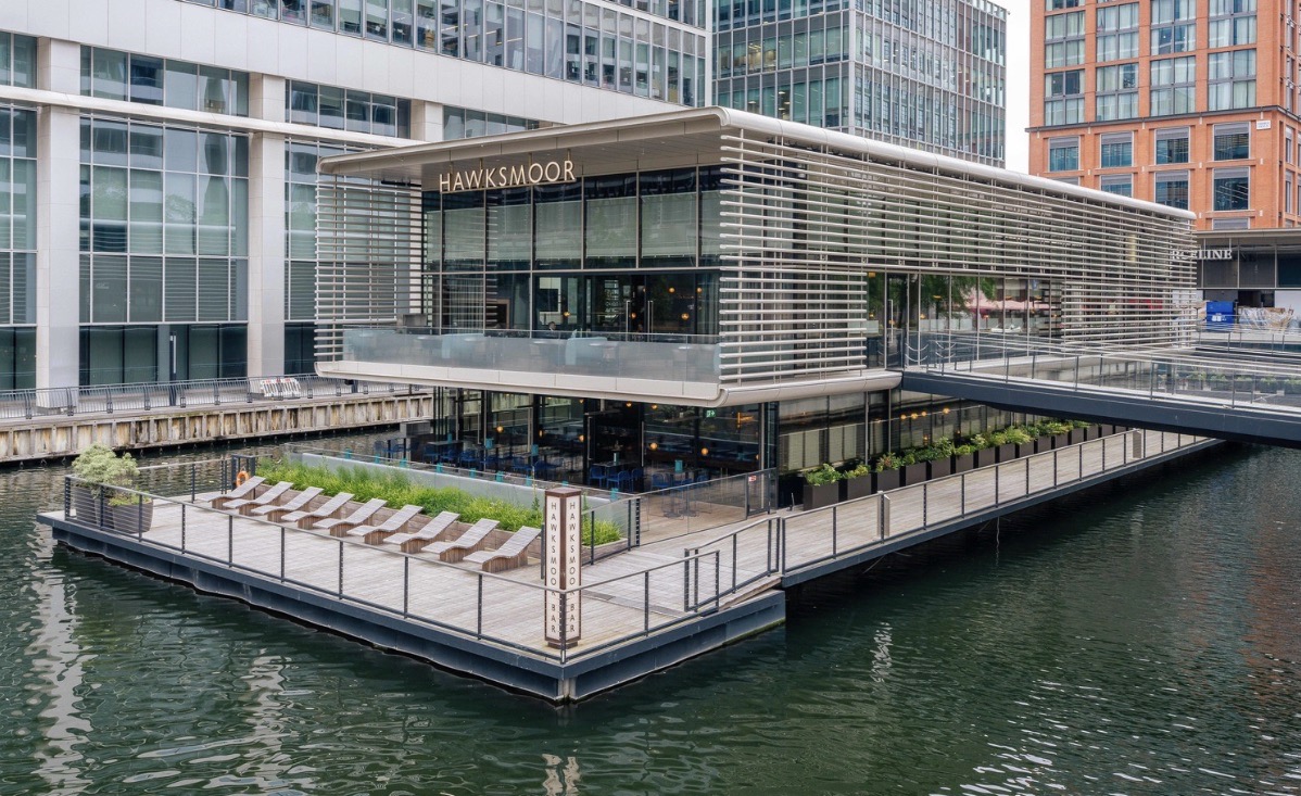 Hawksmoor Wood Wharf represents one of the brand’s most ambitious and eye-catching locations. Housed in an eco-friendly floating pavilion, the restaurant gently rises and falls with the tide – a design feature that adds both character and logistical complexity. The venue combines a dock-level restaurant with a 120-seat waterside bar (formerly known as The Lowback) and a terrace offering sweeping views across the water.