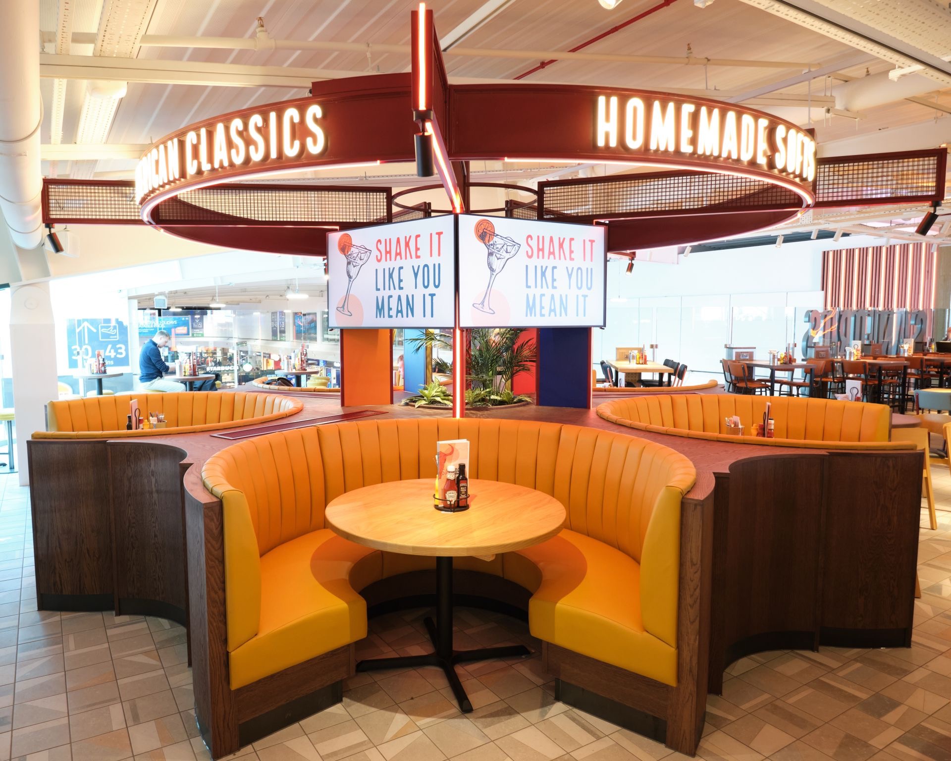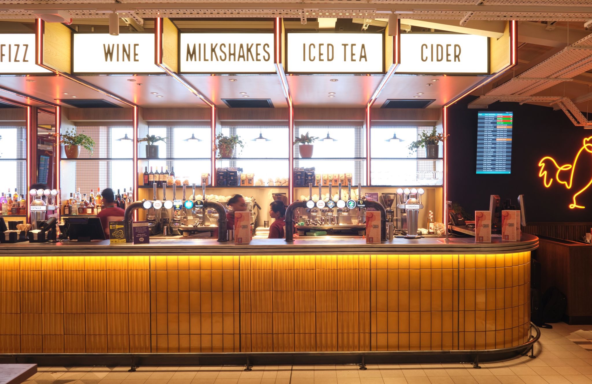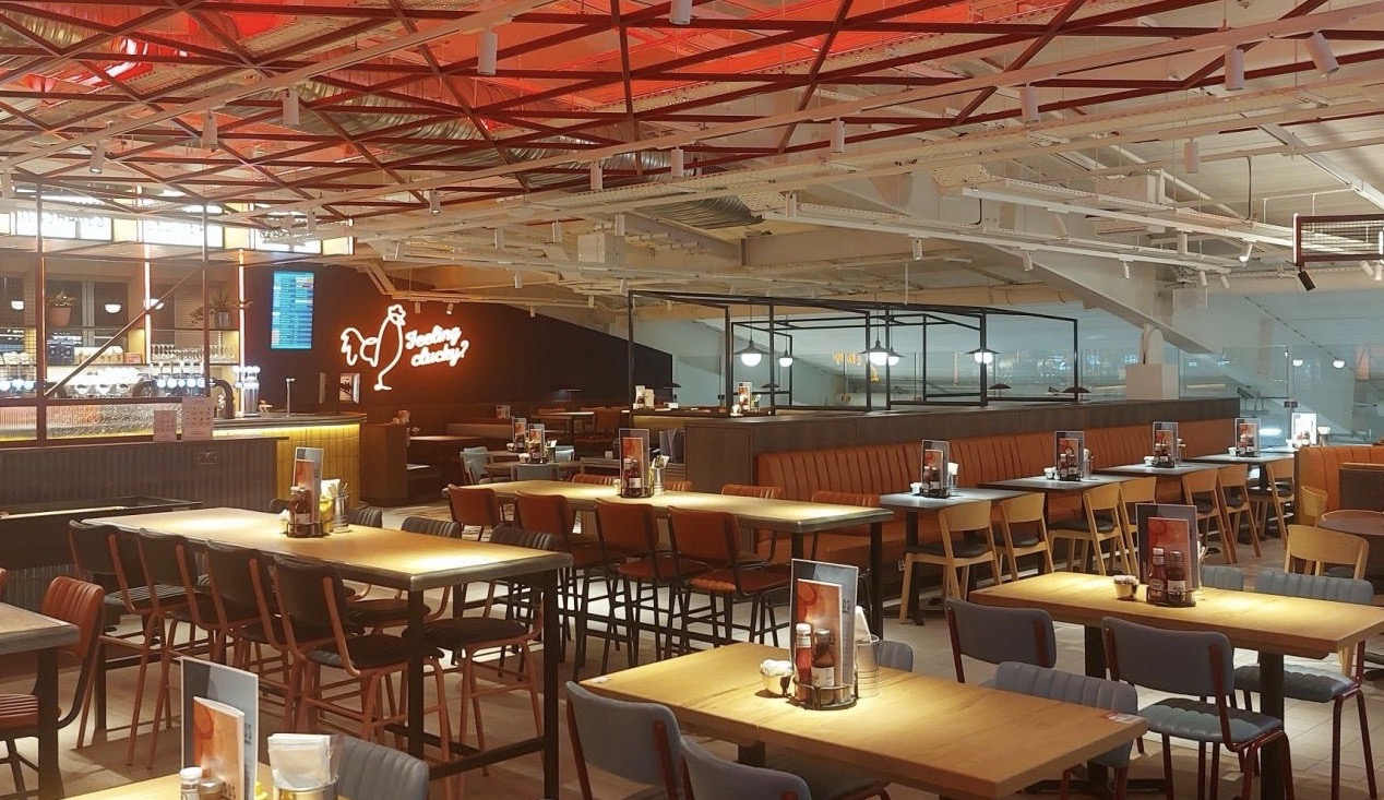 In Luton, the venue is split across two levels: a casual downstairs area and a mezzanine-level space that brings a livelier, bar-style vibe. Glasgow offers a similar setup, with the addition of more discreet AV integration requirements due to terminal layout.